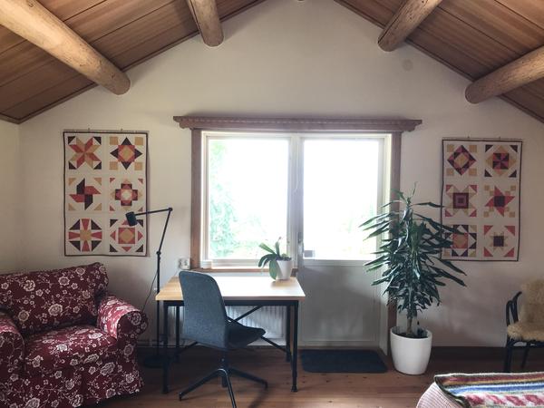 I finished my work today on your wonderful quilt design and I wanted to send this along right away. Pretty good to finish and hang a sunshine quilt on the summer solstice, right? They are just what I need to flank the windows of the main room of my guest cottage overlooking Lake Silja in