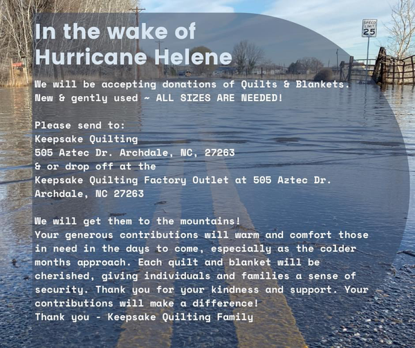 Thank you for all the kind words from last week's newsletter and our experience with Helene. It is humbling to see the destruction from this storm, but very heartening to find many quilters organizing quilt donations. I've compiled a list of links below if you have quilts to donate and are looking for ways to assist: